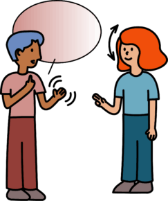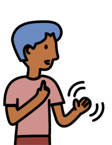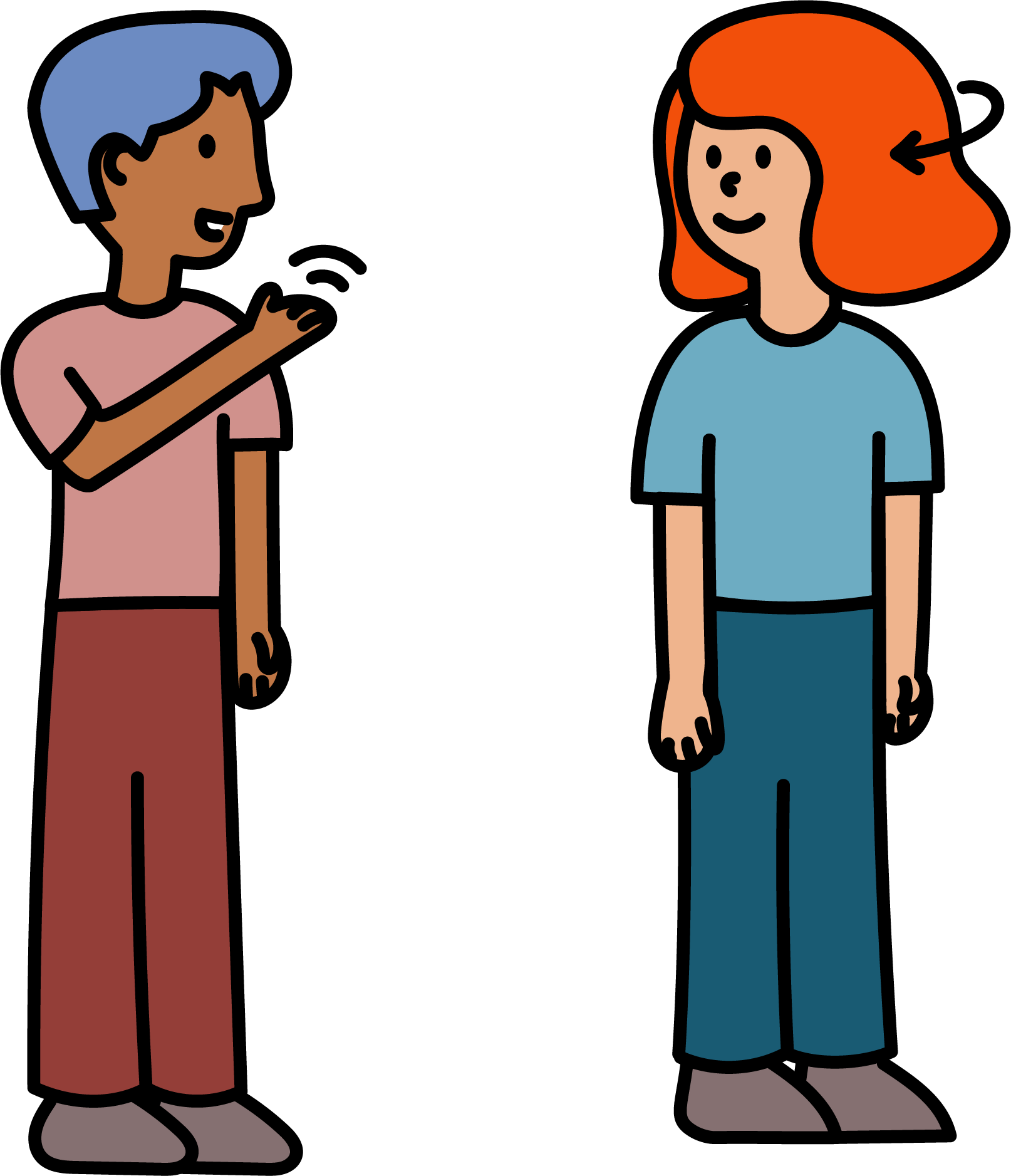 • Man schaut eine Person an, um zu zeigen, dass man ein Gespräch beginnen möchte. Man wartet, bis die Person den Blickkontakt aufnimmt und fängt dann an zu gebärden.