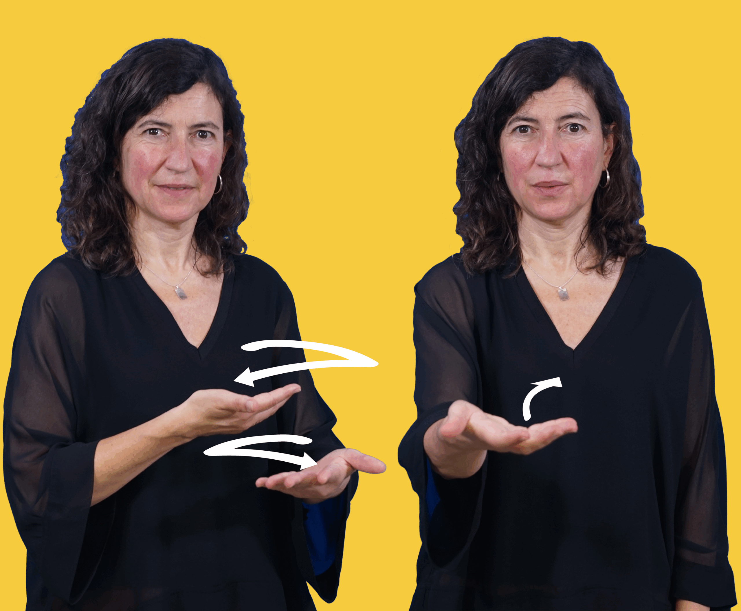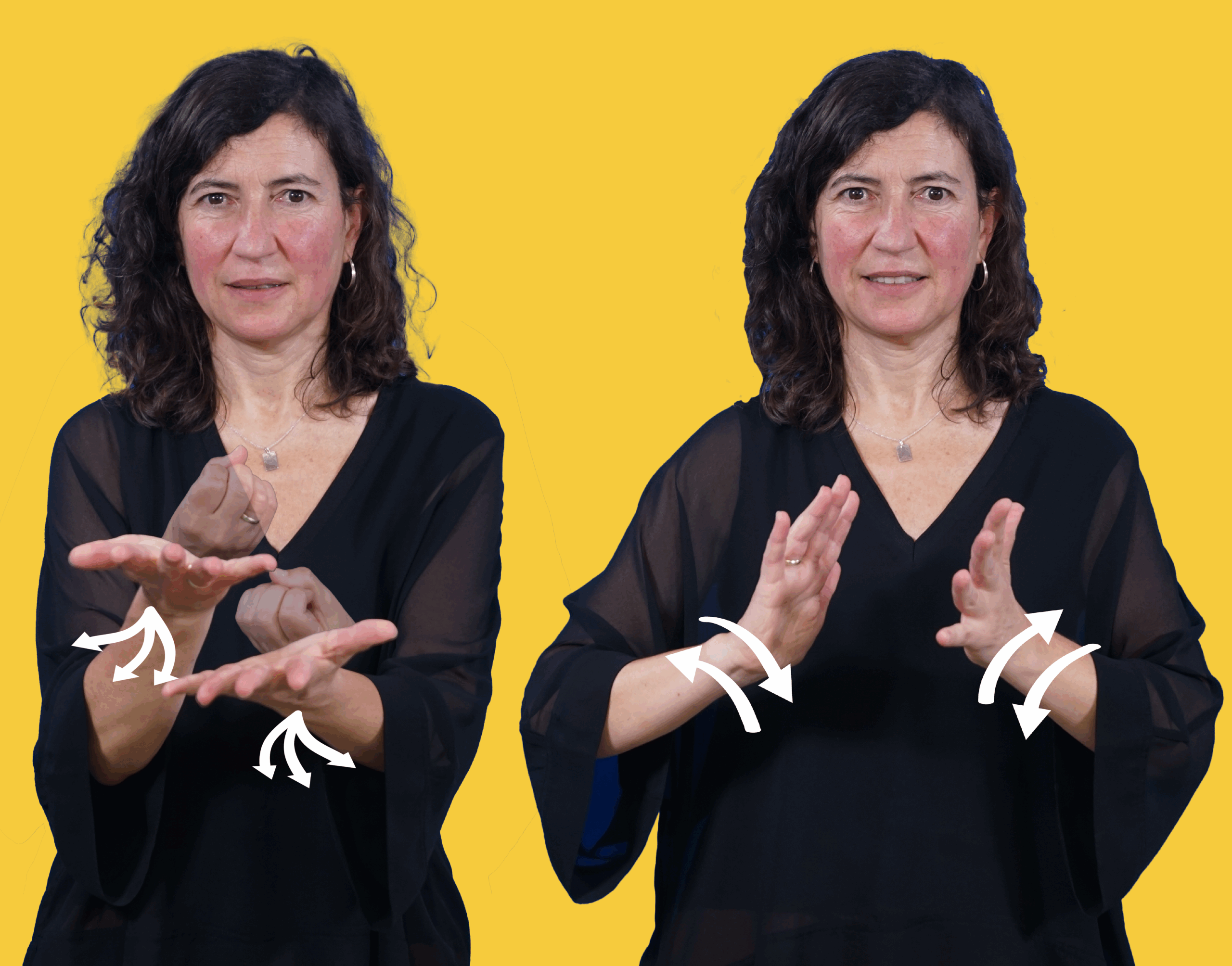 • Der Empfänger hebt die Hände in den Gebärdenraum, um zu zeigen, dass er anfangen möchte zu gebärden. Der Empfänger wartet dann, bis der Sender aufhört zu gebärden und den Empfänger anschaut. Dann fängt er an zu gebärden.