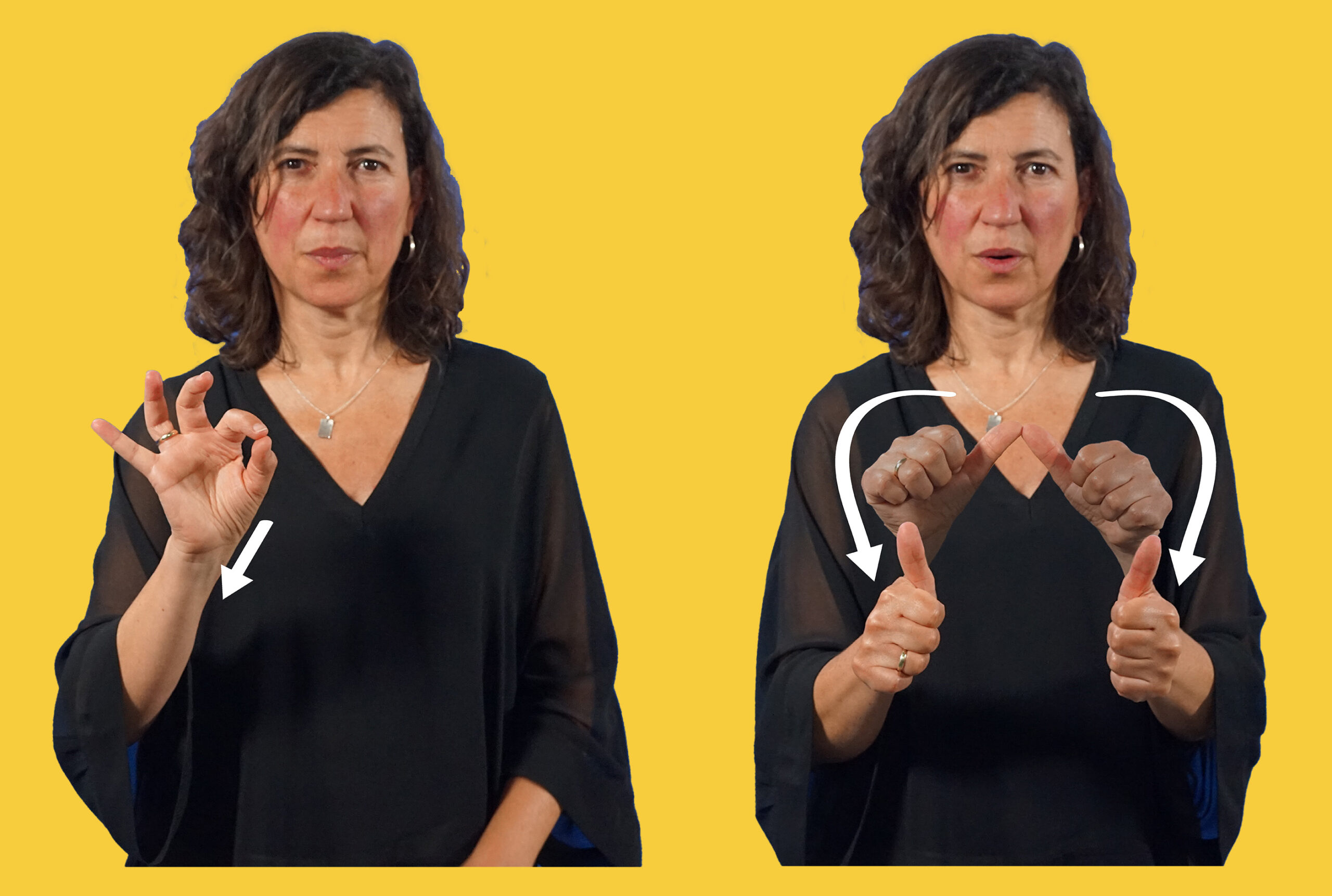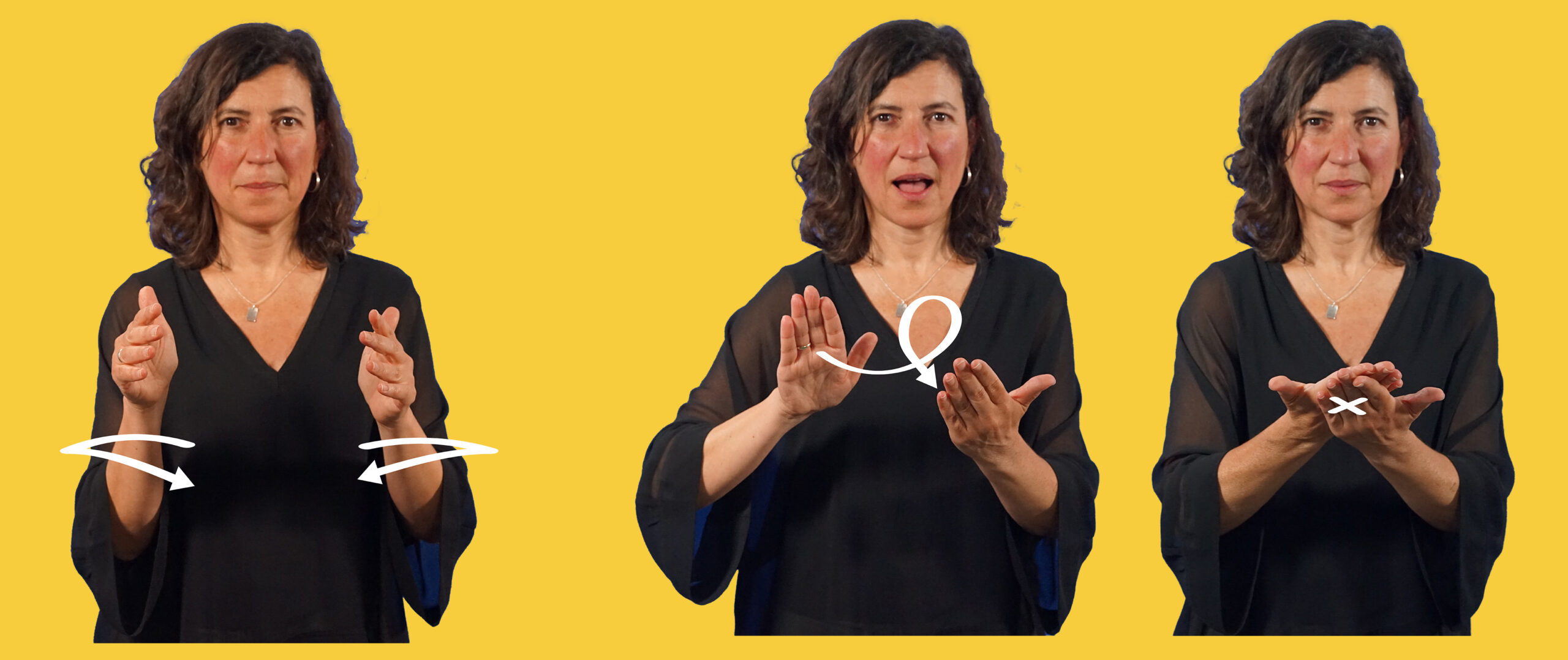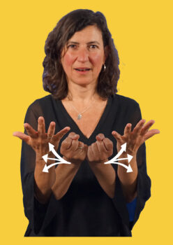 Die Wiederholung der Gebärde drückt den Plural aus. Gleichzeitig wird die Gebärde an einem bestimmten Ort im Gebärdenraum platziert.