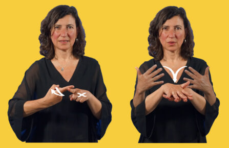 Ein Beispiel ist die Gebärde PLAKAT. Die Wiederholung wird seitlich nebeneinander ausgeführt.