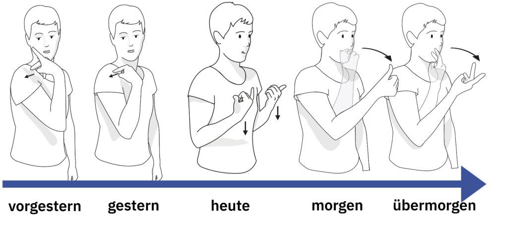 Wir können Gebärden im Gebärdenraum an verschiedenen Stellen ausführen und zeigen damit, ob ein Ereignis in der Gegenwart, in der Vergangenheit oder in der Zukunft stattgefunden hat beziehungsweise stattfindet. Dafür werden verschiedene Zeitlinien benutzt.
