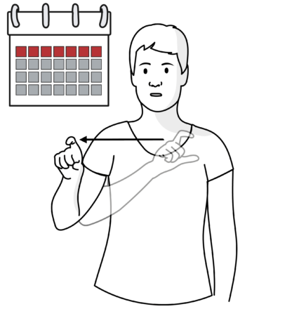 Es kann mit der Hand ein Kalender in den Gebärdenraum gezeichnet werden. Anschließend werden Ereignisse auf dieser Kalenderebene eingeordnet. Dafür benutze ich die gleichen Mittel wie bei der sagittalen und der horizontalen Zeitlinie (zum Beispiel Blickrichtung, Zeigen, Bojen).