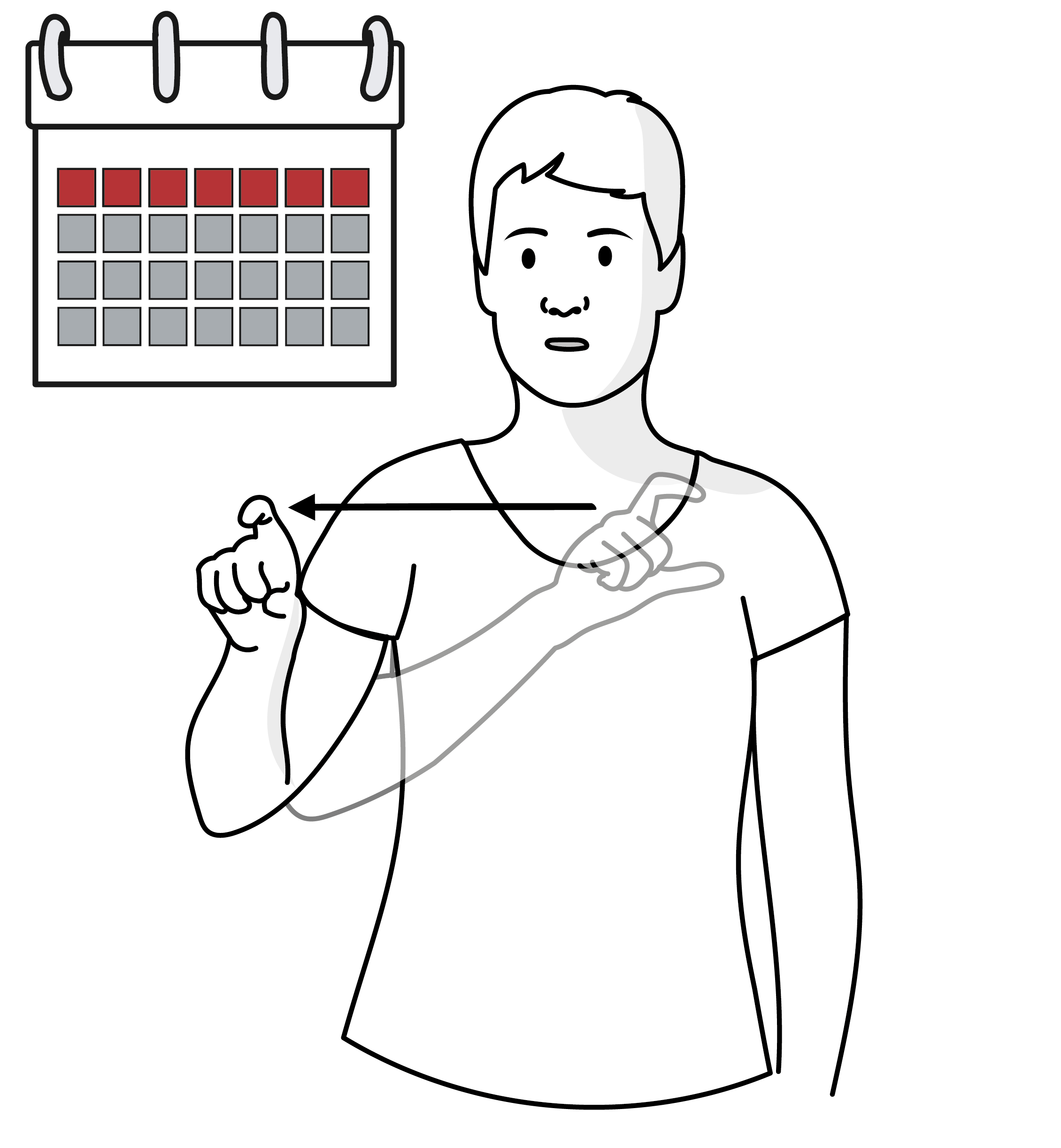 Ereignisse, die vor diesem Zeitpunkt stattgefunden haben, werden vom Oberkörper aus vor diesem Zeitpunkt verortet. Die Ereignisse, die nach dem festgelegten Zeitpunkt stattgefunden haben oder stattfinden werden, werden vom Oberkörper aus hinter diesem Zeitpunkt gebärdet.