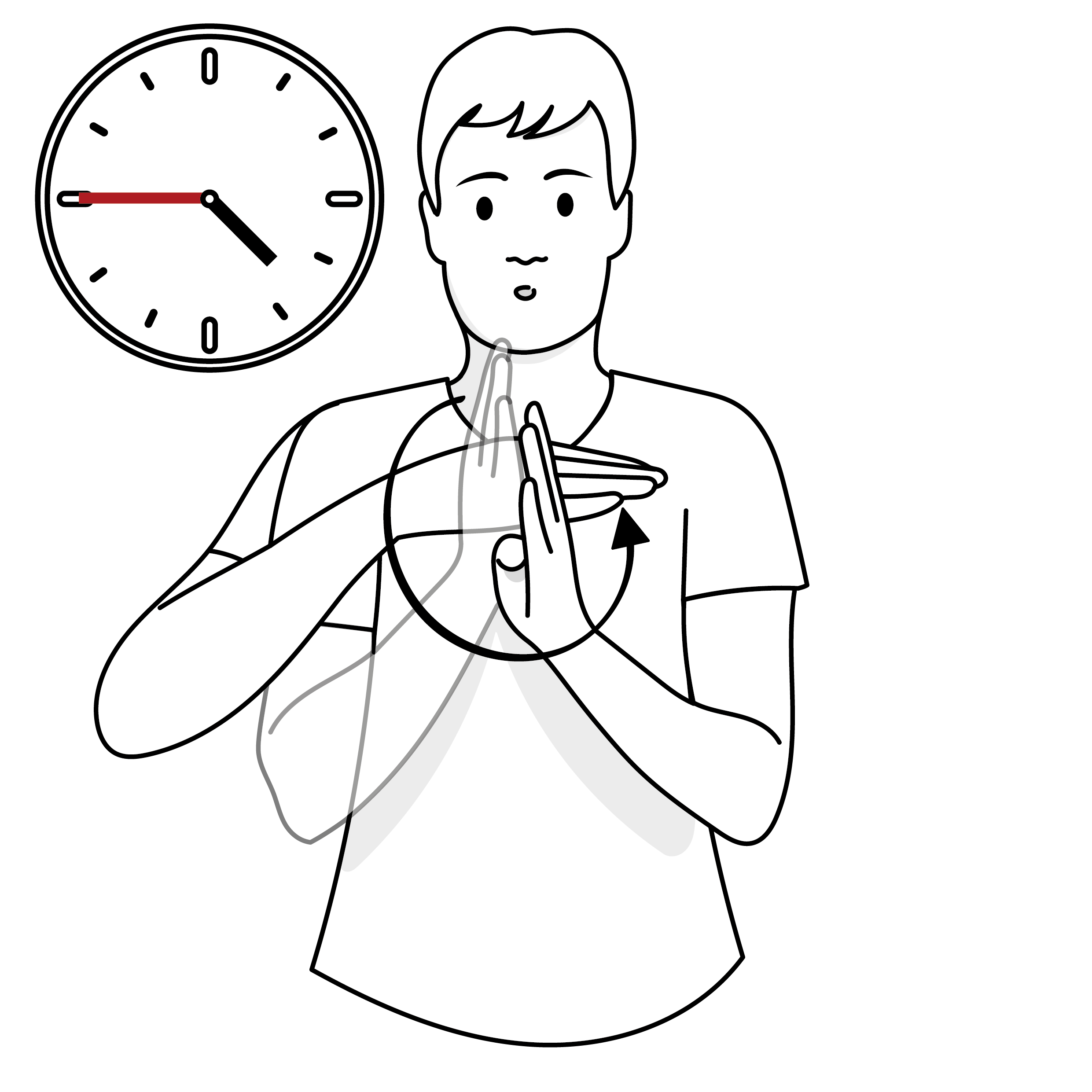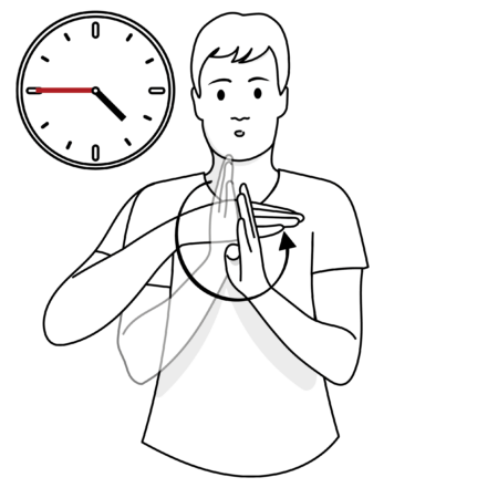 Es kann auch eine Uhr in den Gebärdenraum gezeichnet werden, um dort Ereignisse zeitlich anzuordnen. Dabei wird die nicht-dominante Hand meist als Boje verwendet, die auf 12 Uhr zeigt. Mit der dominanten Hand gibt man den zeitlichen Verlauf an.