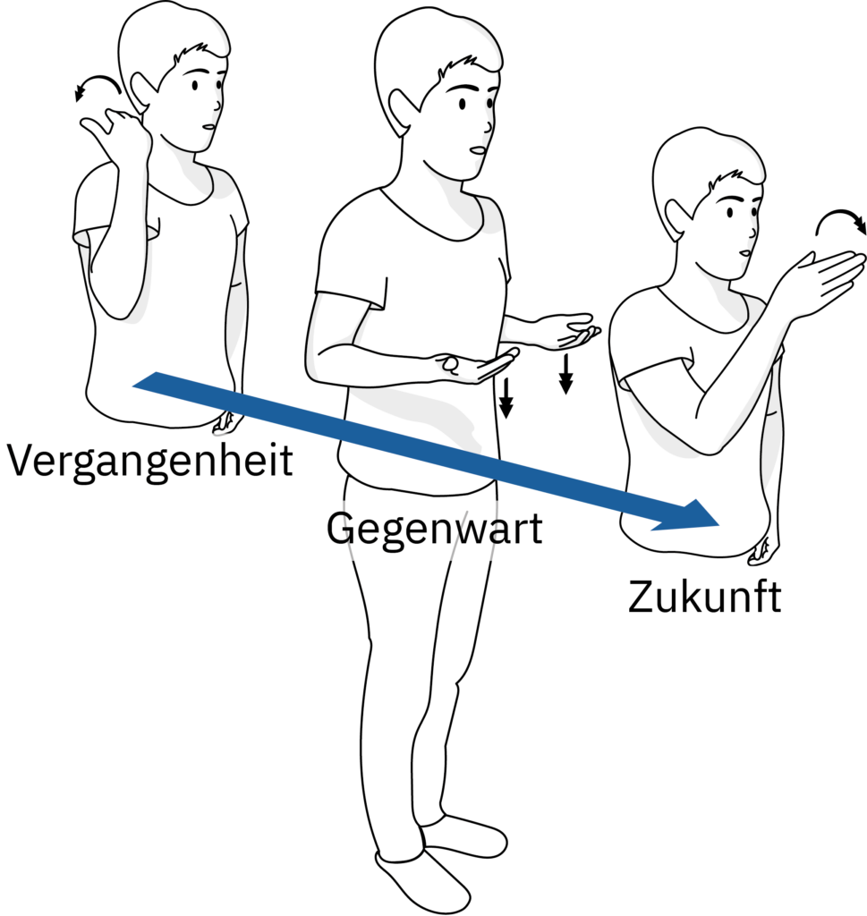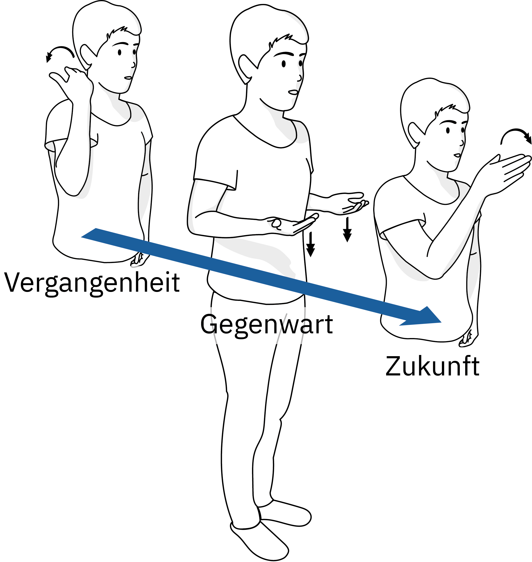 Wir können Gebärden im Gebärdenraum an verschiedenen Stellen ausführen und zeigen damit, ob ein Ereignis in der Gegenwart, in der Vergangenheit oder in der Zukunft stattgefunden hat beziehungsweise stattfindet. Dafür werden verschiedene Zeitlinien benutzt.