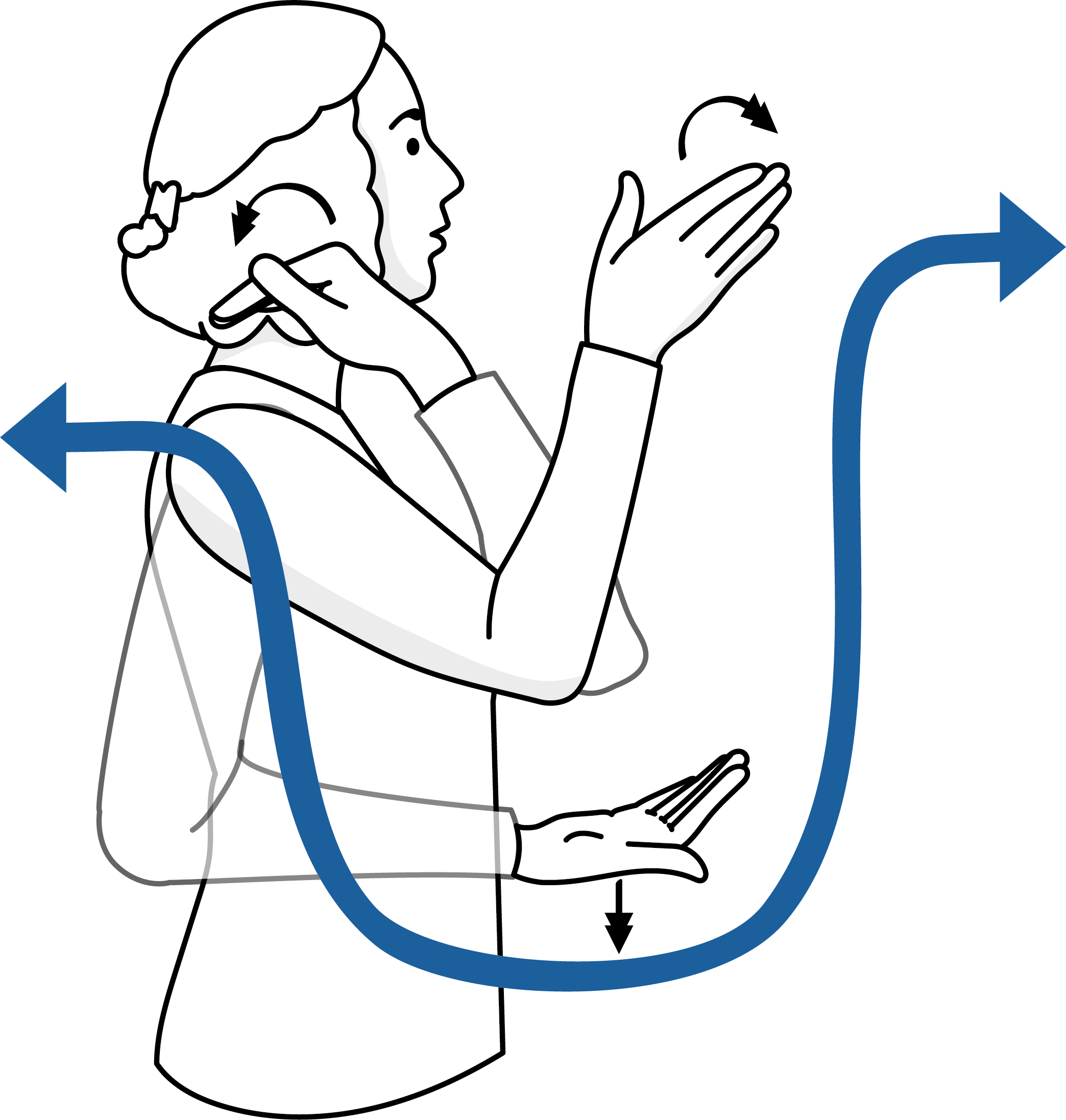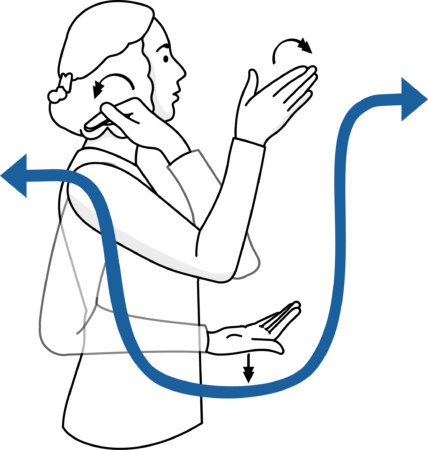 Die sagittale Zeitlinie verläuft von der Schulter der dominanten Hand bis in den Gebärdenraum vor dem Oberkörper.