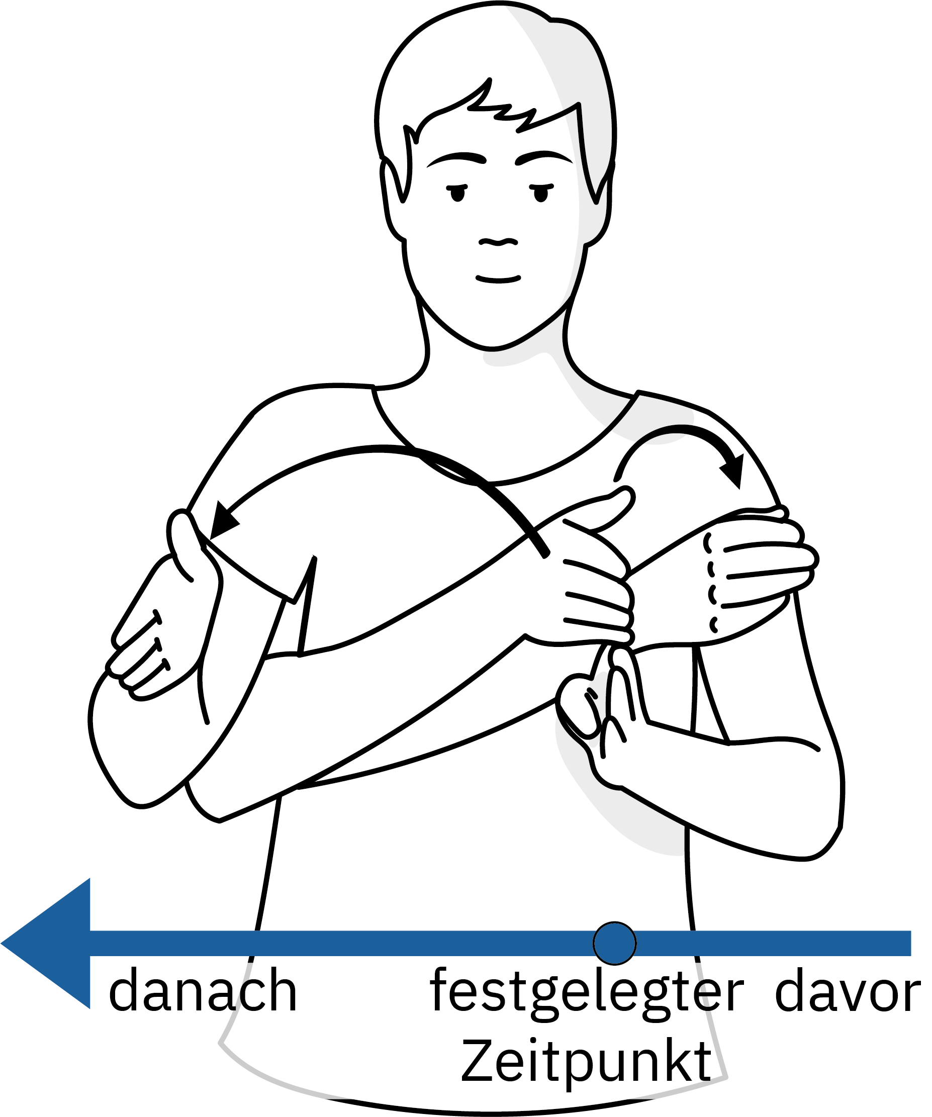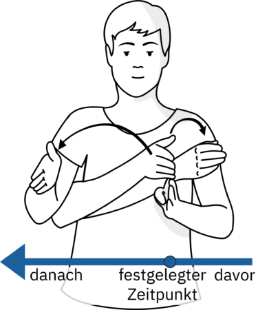 Ereignisse, die vor diesem Zeitpunkt stattgefunden haben, werden vom Oberkörper aus vor diesem Zeitpunkt verortet. Die Ereignisse, die nach dem festgelegten Zeitpunkt stattgefunden haben oder stattfinden werden, werden vom Oberkörper aus hinter diesem Zeitpunkt gebärdet.