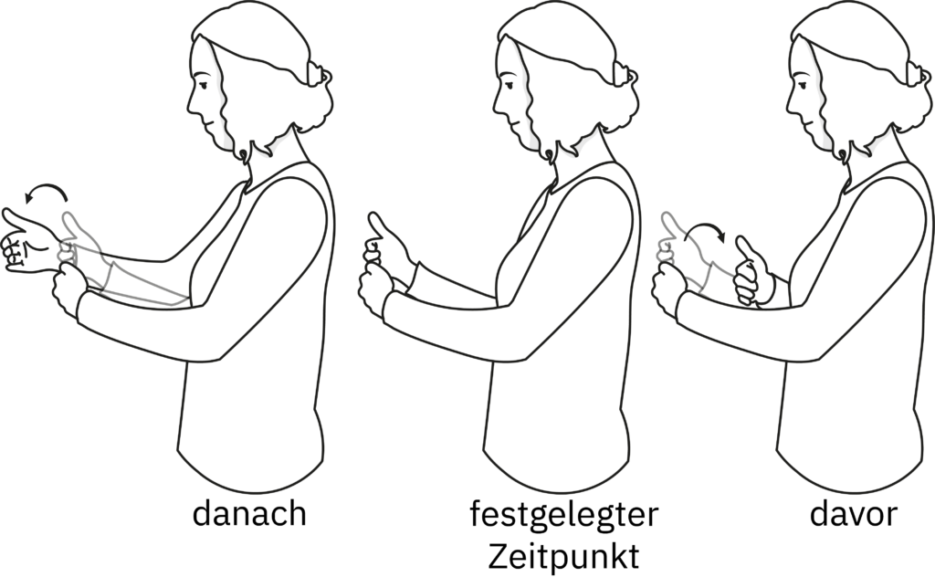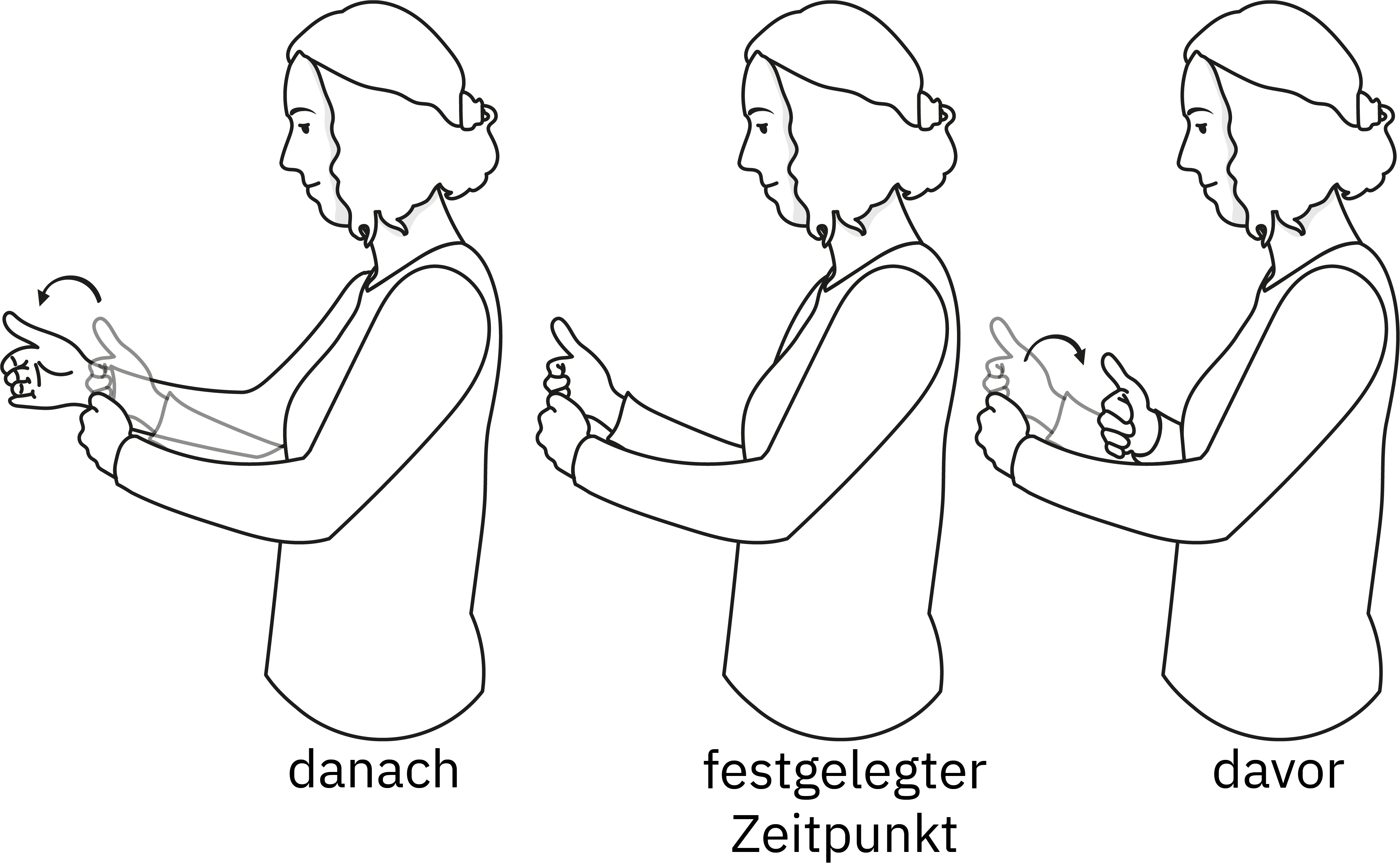 Es gibt noch weitere Möglichkeiten, Zeit im Gebärdenraum zu visualisieren und Ereignisse zeitlich zu verorten.