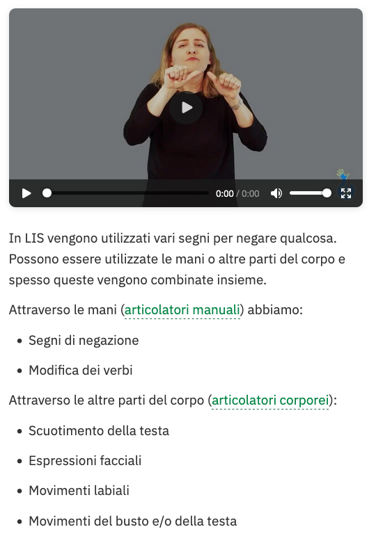 In primo piano ci sono le spiegazioni segnate, mentre sotto al video è disponibile la traduzione in una lingua scritta. Nei testi scritti sono presenti collegamenti ipertestuali ai termini tecnici aggiuntivi.