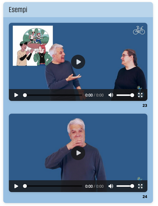 Esempi = sono i video con sfondo blu. Alcuni esempi sono tratti dai testi in lingua dei segni contenuti nella sezione “Dai un’occhiata”. Puoi riconoscerli grazie alle illustrazioni incluse nel video.