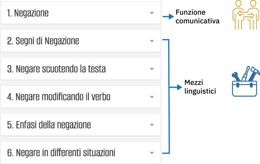 Il primo capitolo della unità introduce la funzione comunicativa dell’argomento trattato, mentre i capitoli successivi spiegano quali sono i mezzi linguistici utilizzati per esprimerla. Tutti i testi sono segnati da persone sorde.