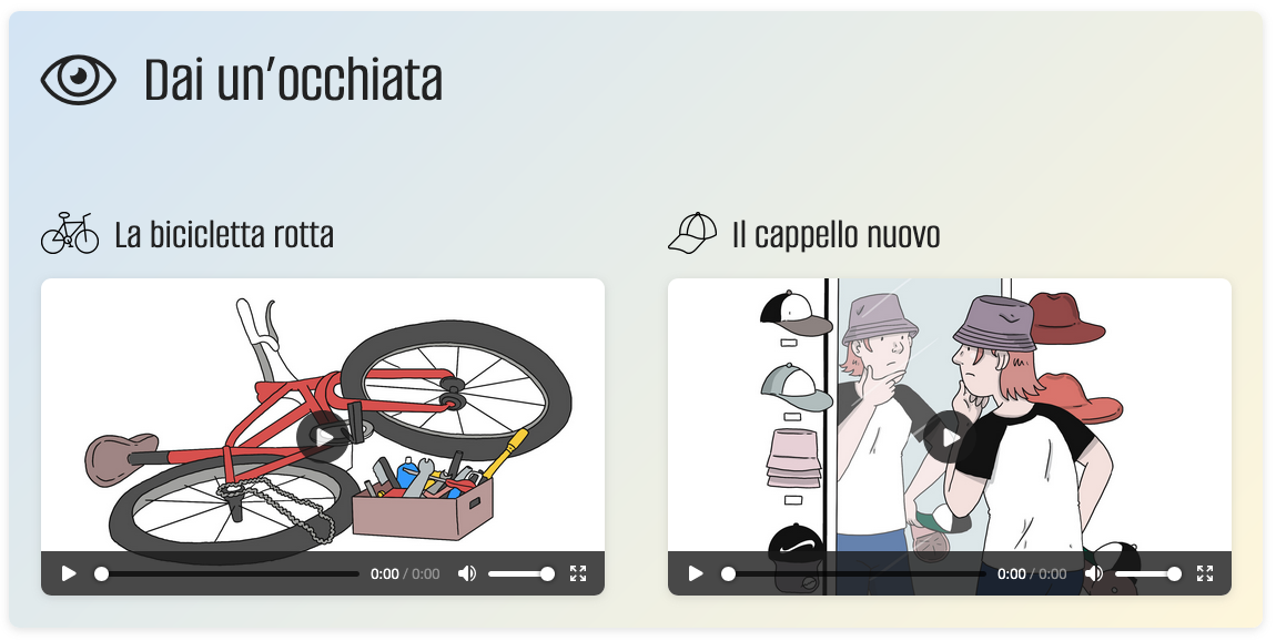 Esempi = sono i video con sfondo blu. Alcuni esempi sono tratti dai testi in lingua dei segni contenuti nella sezione “Dai un’occhiata”. Puoi riconoscerli grazie alle illustrazioni incluse nel video.