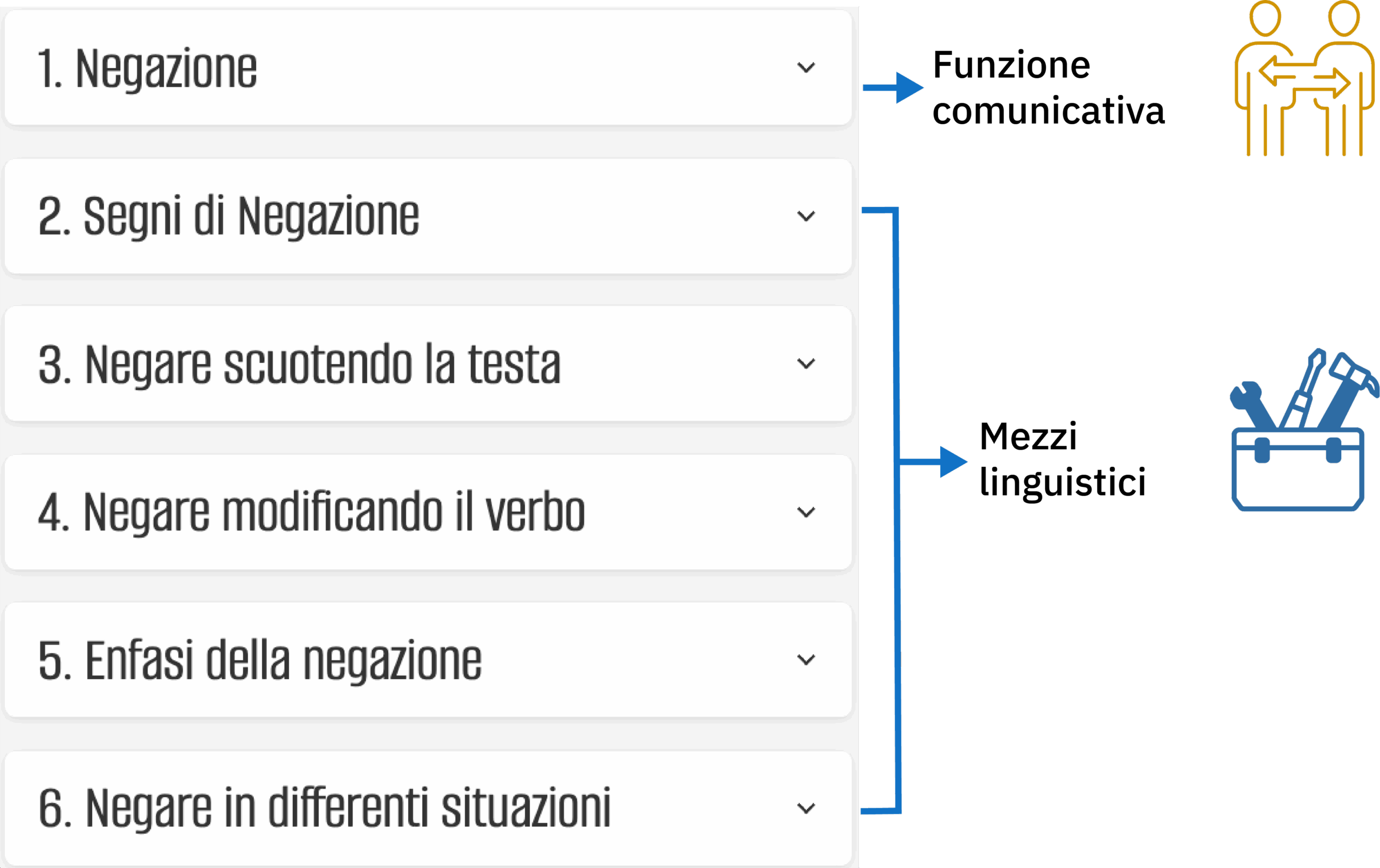 Il primo capitolo della unità introduce la funzione comunicativa dell’argomento trattato, mentre i capitoli successivi spiegano quali sono i mezzi linguistici utilizzati per esprimerla. Tutti i testi sono segnati da persone sorde.