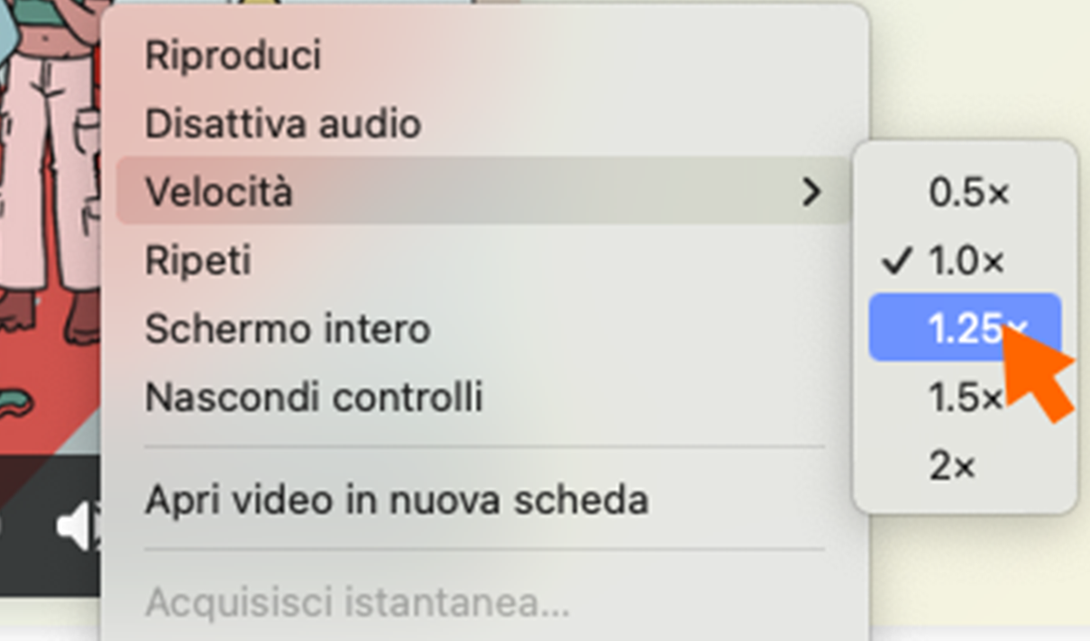 Puoi regolare la velocità di riproduzione del video impostandola su diverse velocità. Il procedimento per farlo è diverso a seconda del browser che utilizzi, sotto sono riportate le istruzioni per Firefox, Google Chrome e Safari.