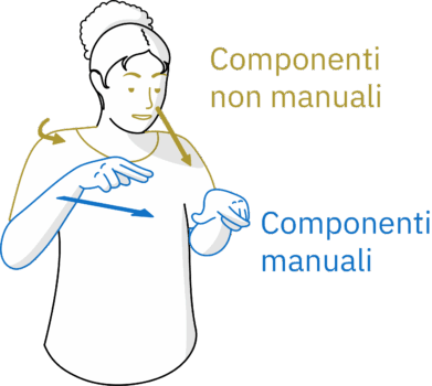 Nelle lingue dei segni è possibile utilizzare diverse parti del corpo per articolare un segno o un’intera frase. Si distingue tra componenti manuali e non manuali. Le componenti manuali includono: