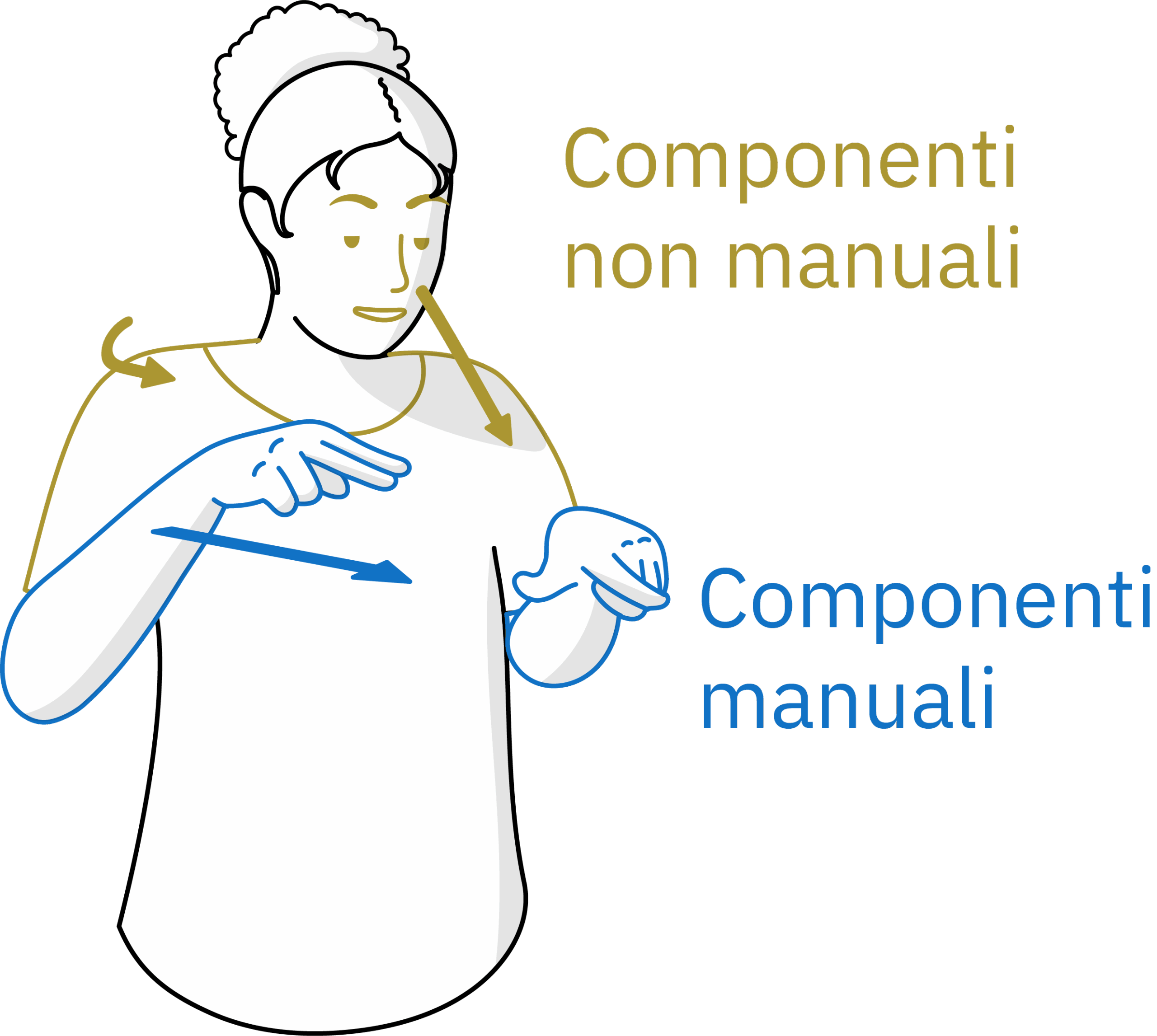 Nelle lingue dei segni è possibile utilizzare diverse parti del corpo per articolare un segno o un’intera frase. Si distingue tra componenti manuali e non manuali. Le componenti manuali includono: