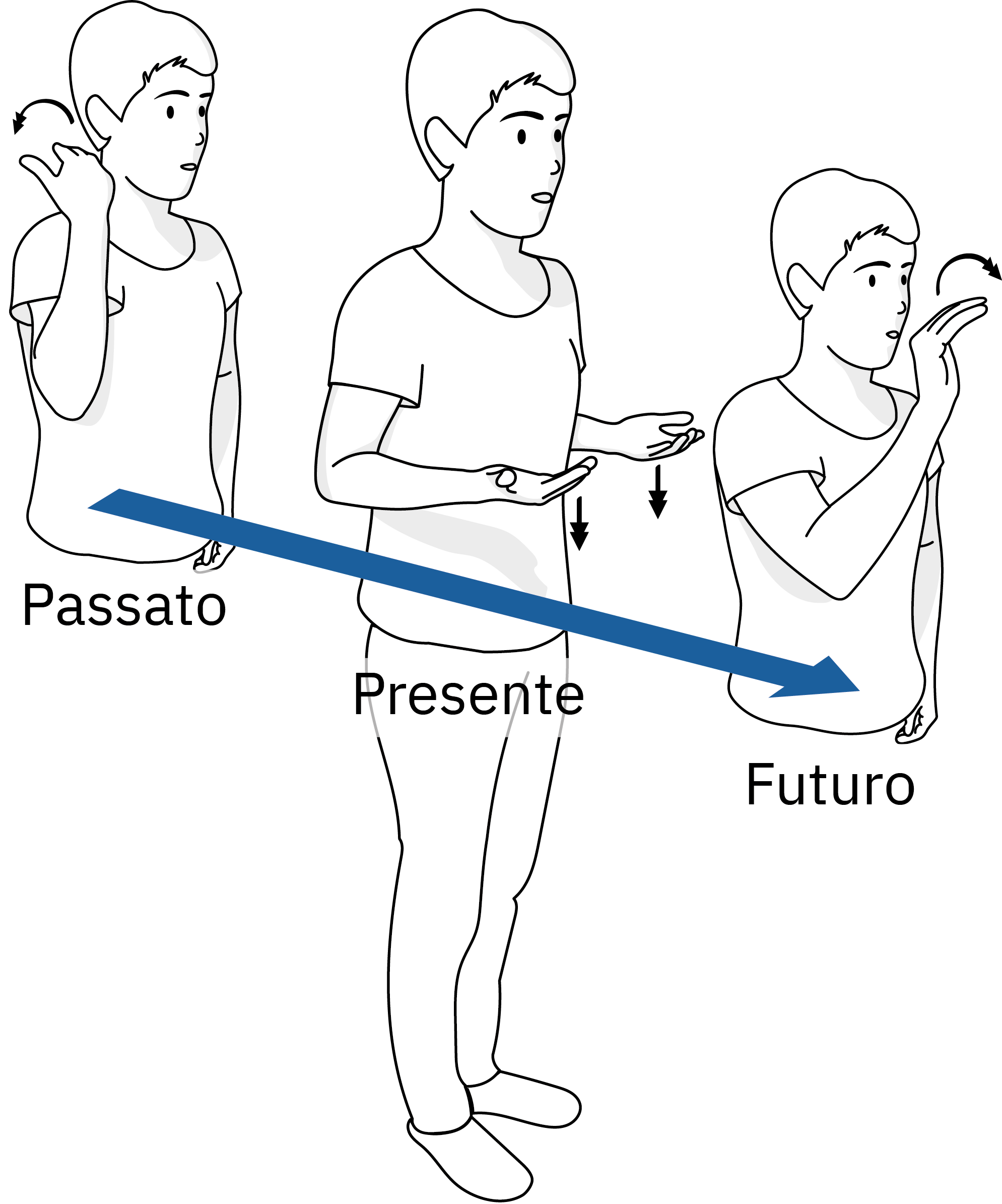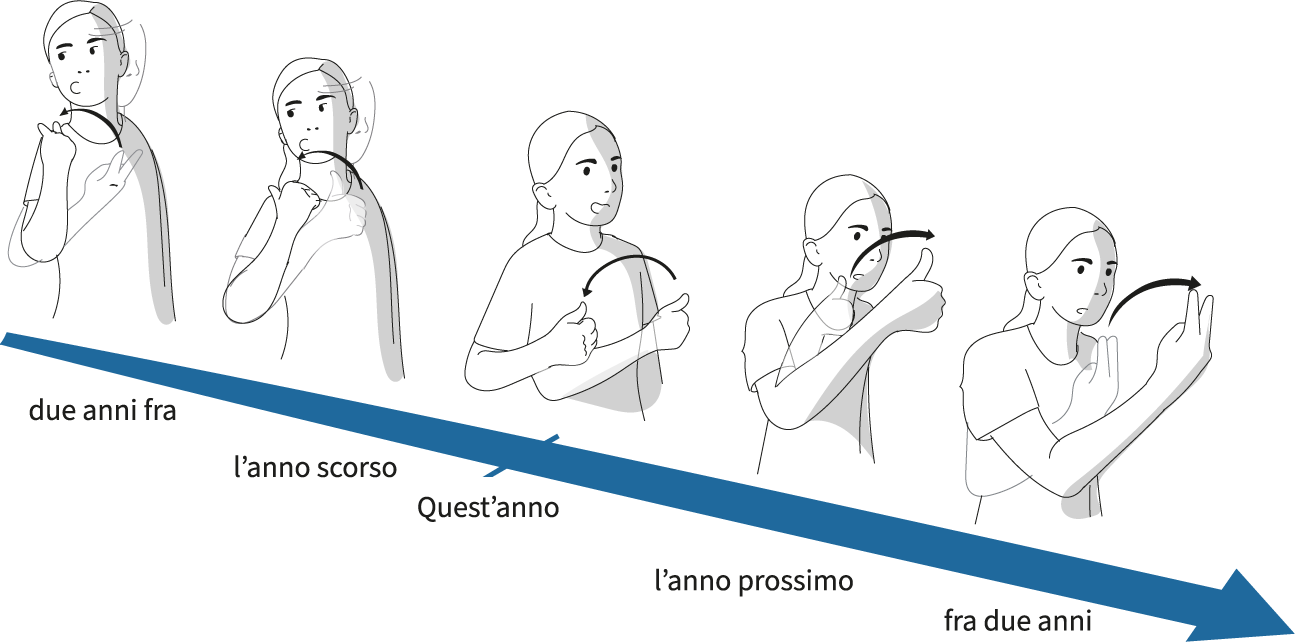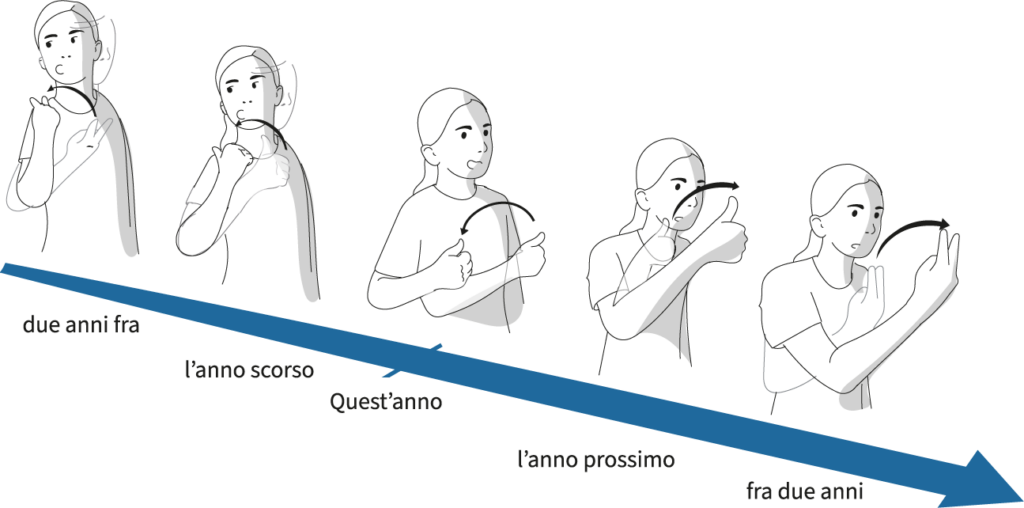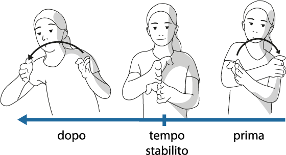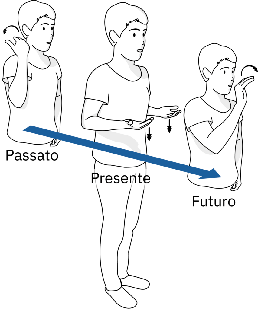 Possiamo posizionare i segni in luoghi diversi dello spazio per mostrare se un evento è accaduto o sta accadendo nel presente, nel passato o nel futuro. A questo scopo vengono utilizzate diverse linee temporali. La linea temporale sagittale va dalla spalla della mano dominante allo spazio davanti al busto.