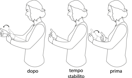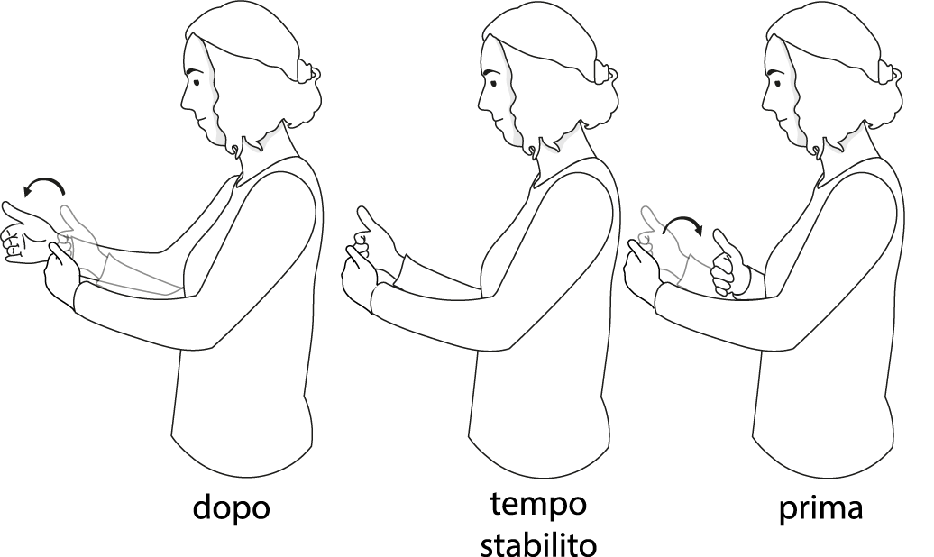 Attenzione: ci sono espressioni temporali che possono essere segnate in una frase senza linea temporale. Ma possono essere integrate con una linea temporale. Ecco un esempio: il segno ‘prima’ o ‘dopo’ può essere eseguito prima di una data (giorno, mese o anno) per sottolineare che l’evento è passato o deve avvenire.