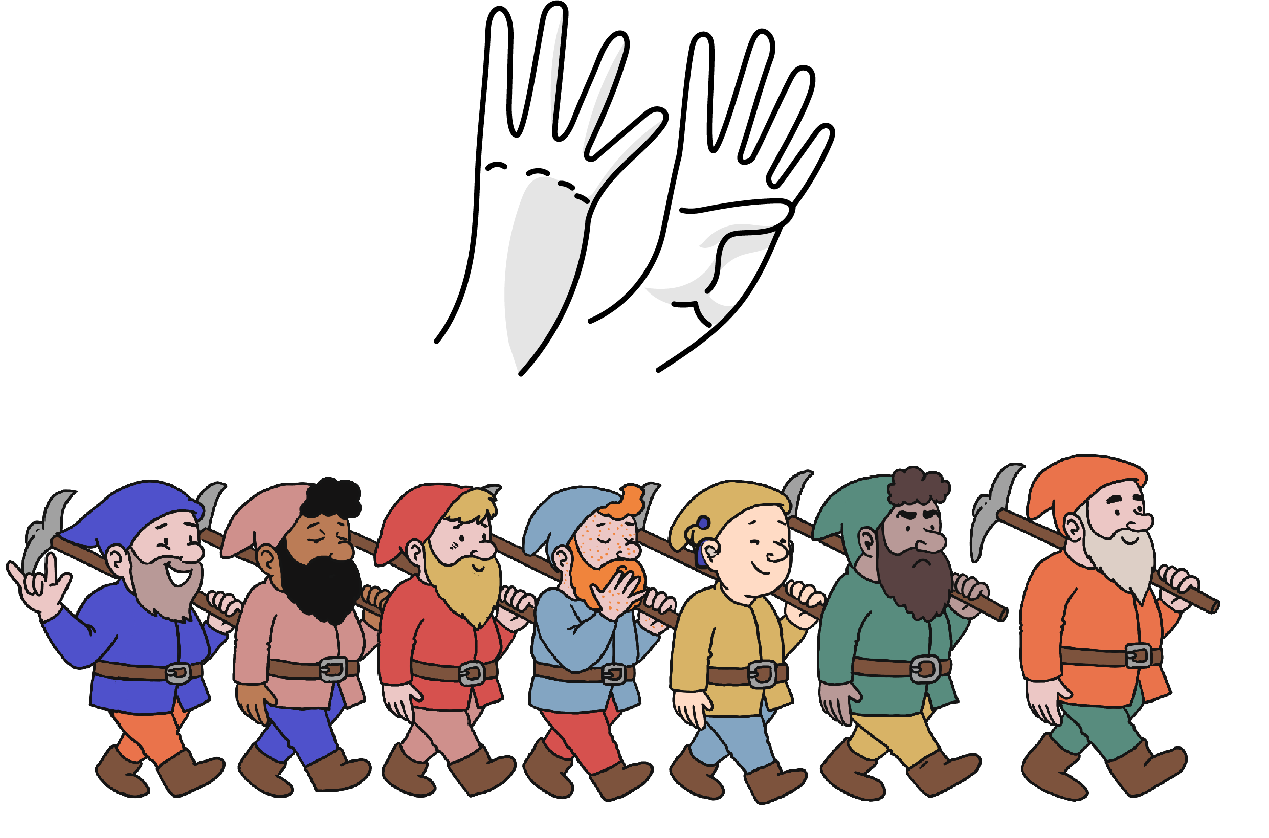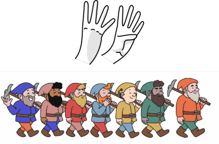 En racontant l’histoire « Blanche-Neige et les sept nains », l’enseignant signe en LSF: « Les nains marchent en rangée. » L’enseignant utilise les deux mains. Un élève l’interrompt et la corrige en lui disant qu’il y a sept et non huit nains. Le professeur répond : «Tu as raison, il y a sept nains. Cependant, vous avez deux options pour effectuer les signes :