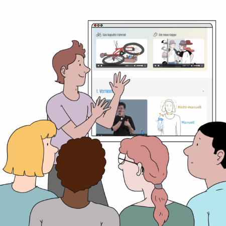 - Les explications dans les langues des signes sont produites dans des variantes régionales. Discutez des différences régionales et sociales avec les élèves pour promouvoir la sensibilisation aux langues. Ils n’ont pas à s’en tenir au dialecte de la vidéo, mais ils peuvent utiliser leur propre variante. Les élèves comprennent alors qu’il existe des variations dans leur langue des signes, et ils apprennent à rester souples.
