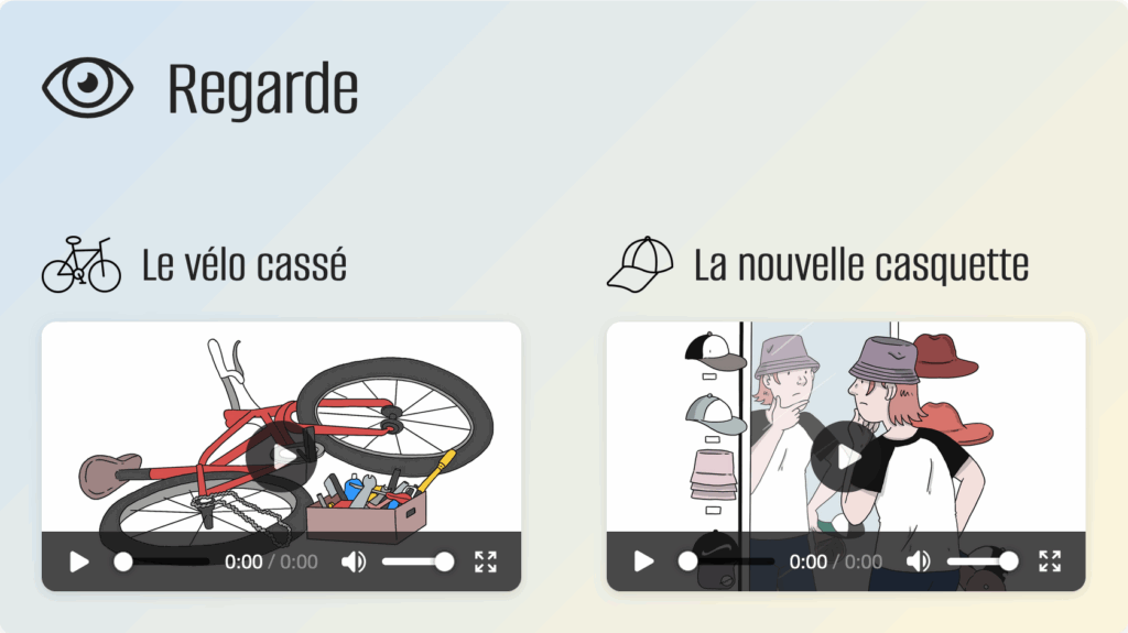 Exemples = vidéos sur fond bleu. Quelques exemples sont tirés des histoires de « Regarde ». Vous pouvez les reconnaître aux dessins dans les exemples.