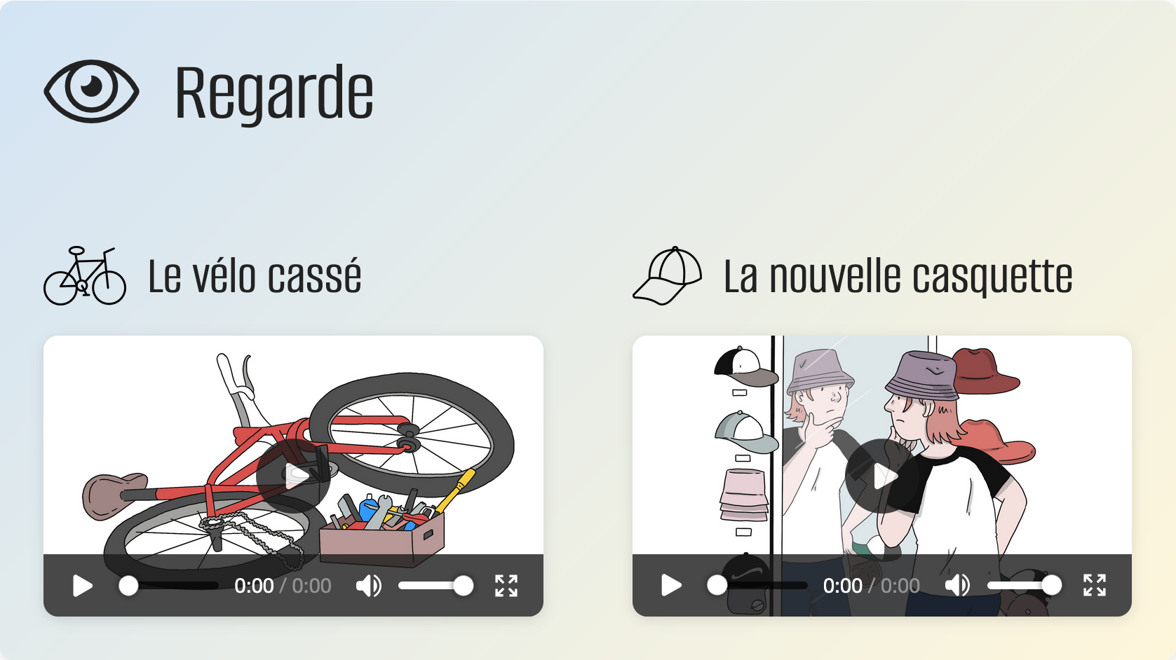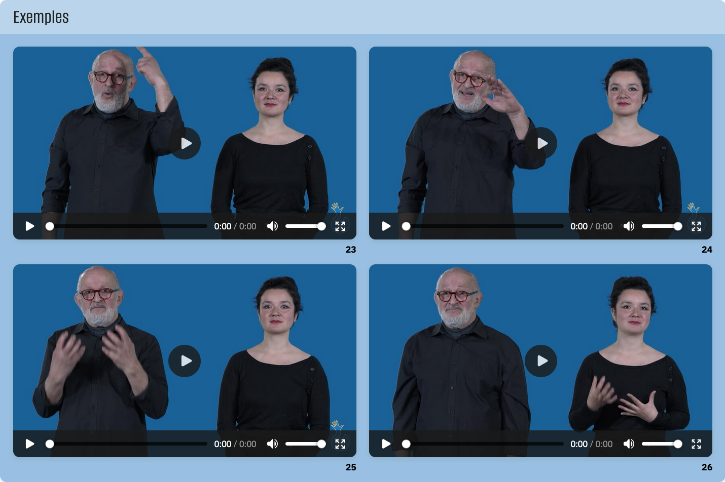 Exemples = vidéos sur fond bleu. Quelques exemples sont tirés des histoires de « Regarde ». Vous pouvez les reconnaître aux dessins dans les exemples.