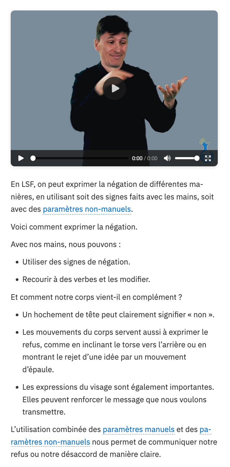 Au début de chaque thème, vous trouverez des histoires en langue des signes. Il s’agit de monologues ou de dialogues. Ces histoires contiennent des exemples de la vie quotidienne pour la fonction de communication et ses moyens linguistiques et culturels. Les histoires sont racontées par des signeurs sourds expérimentés et sont racontées dans un langage courant. Elles varient en difficulté et sont toutes illustrées.