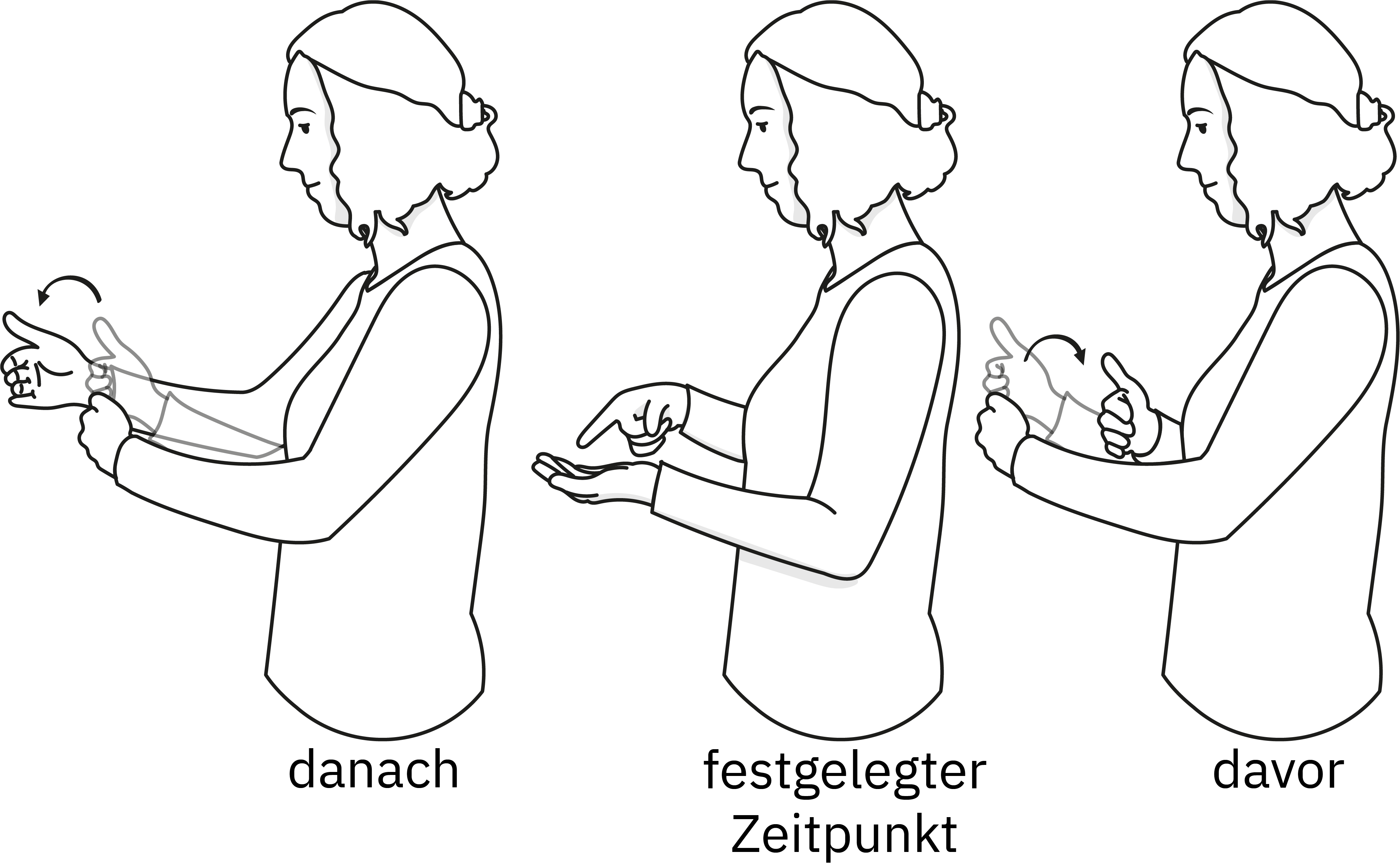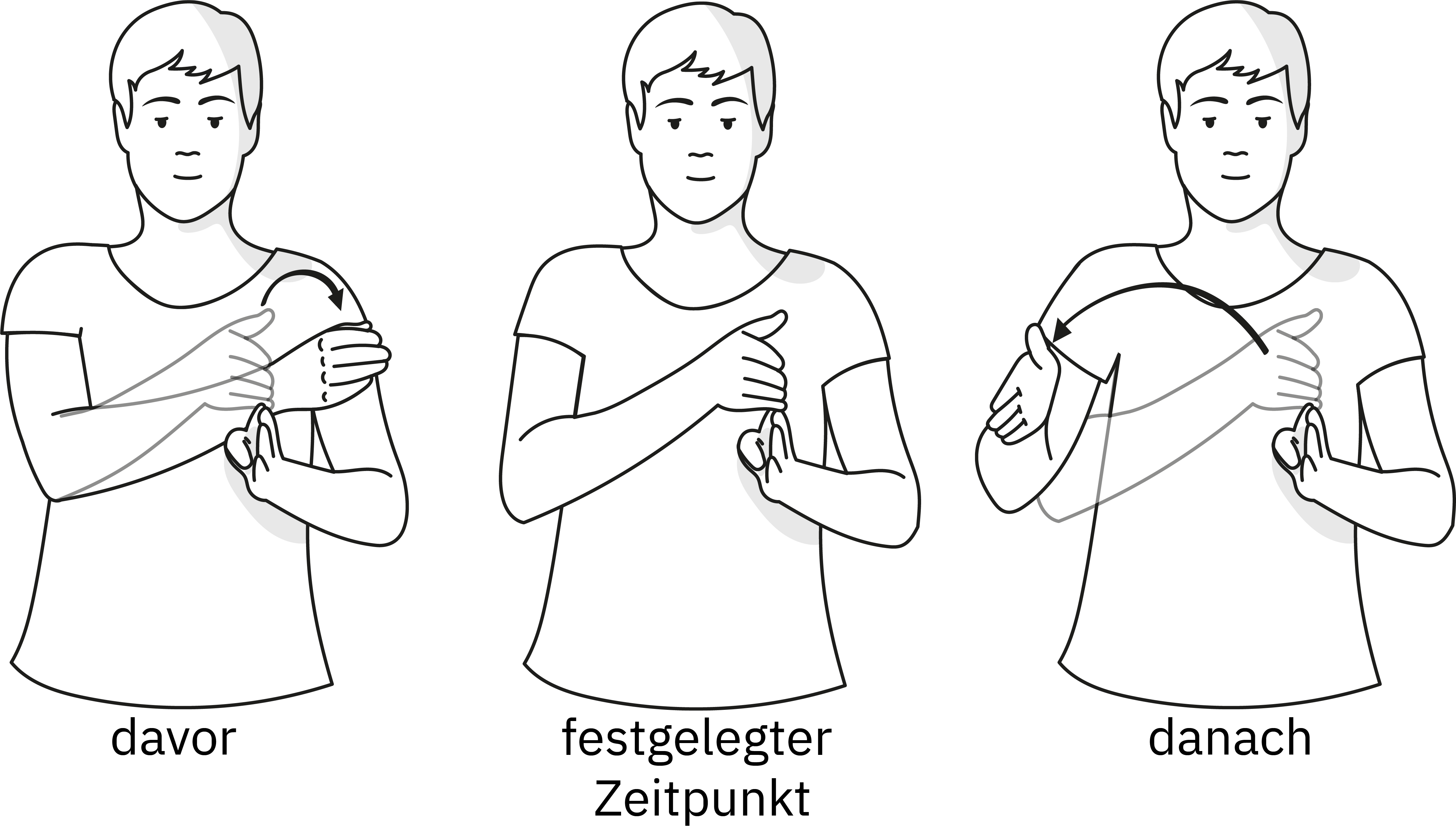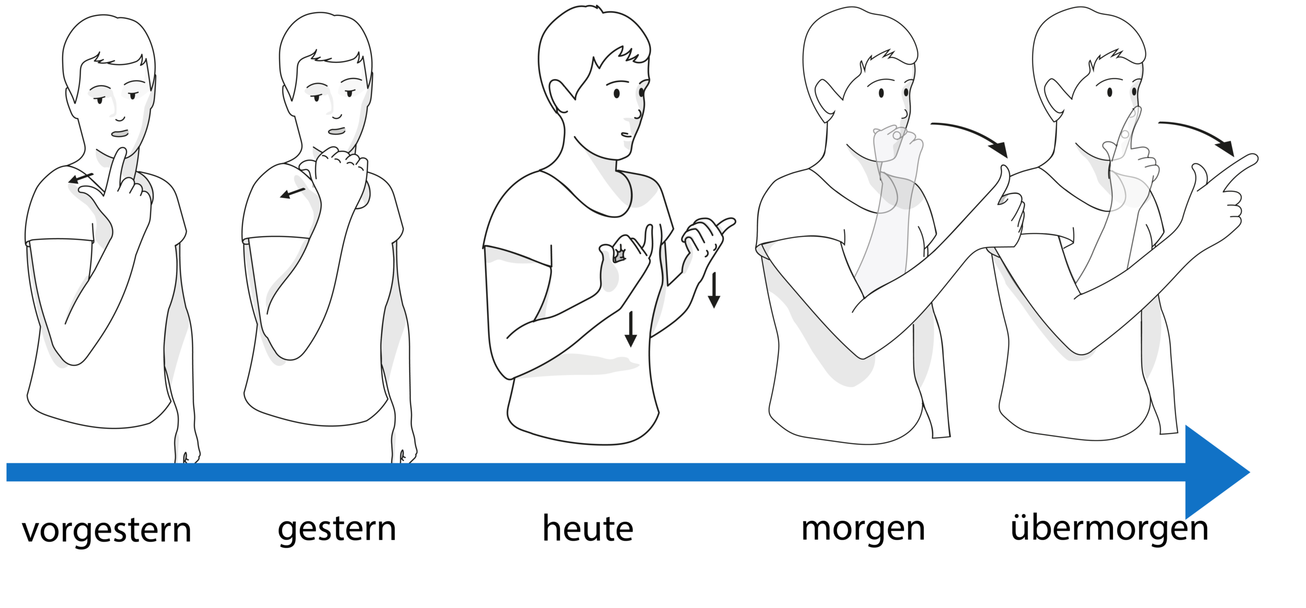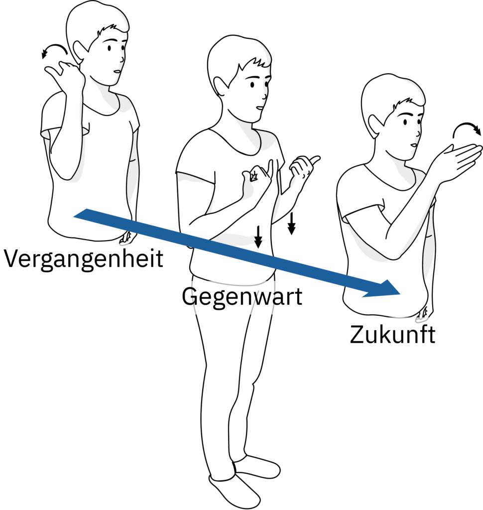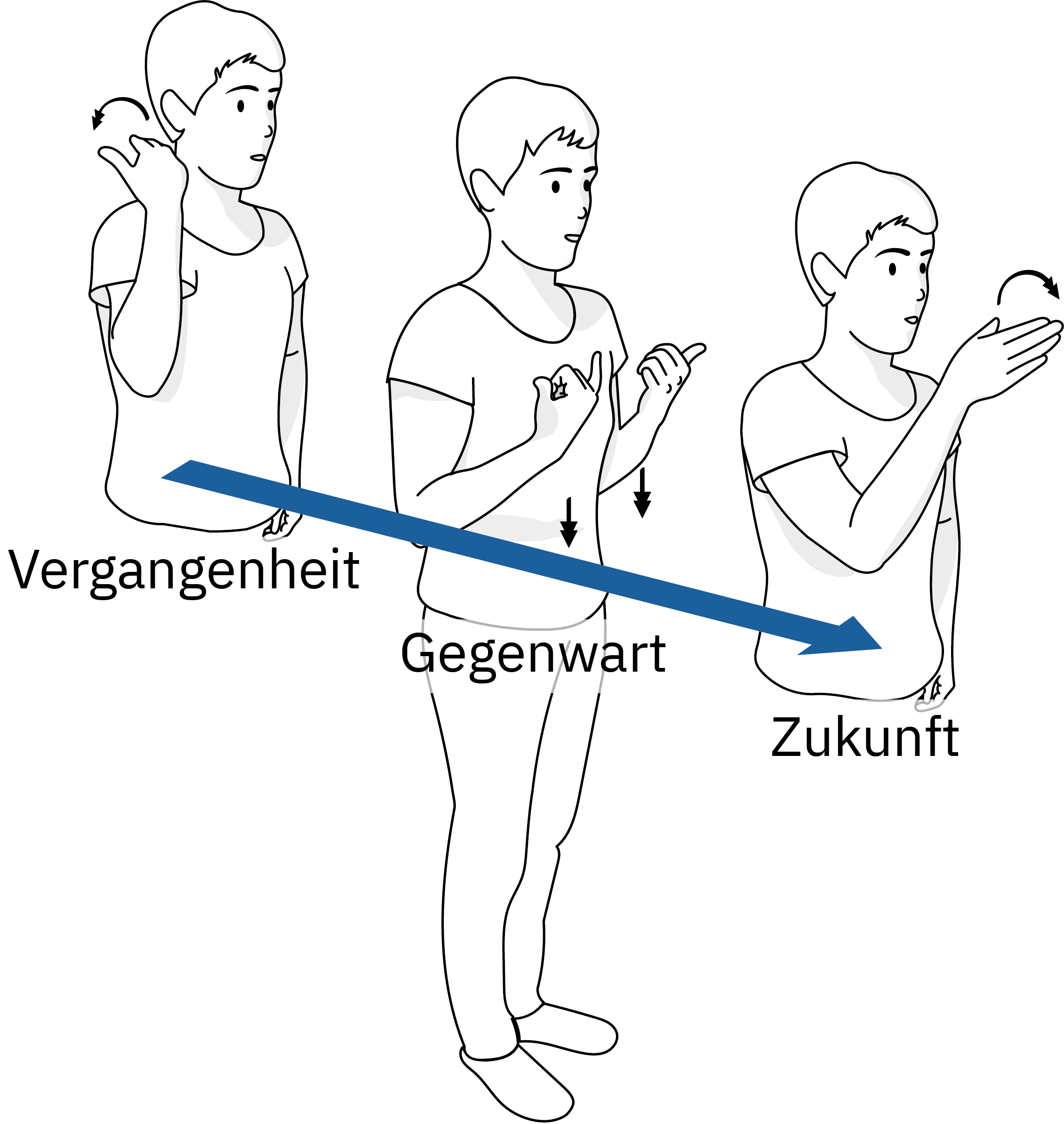 Wir können Gebärden im Gebärdenraum an verschiedenen Stellen ausführen und zeigen damit, ob ein Ereignis in der Gegenwart, in der Vergangenheit oder in der Zukunft stattgefunden hat beziehungsweise stattfindet. Dafür werden verschiedene Zeitlinien benutzt.