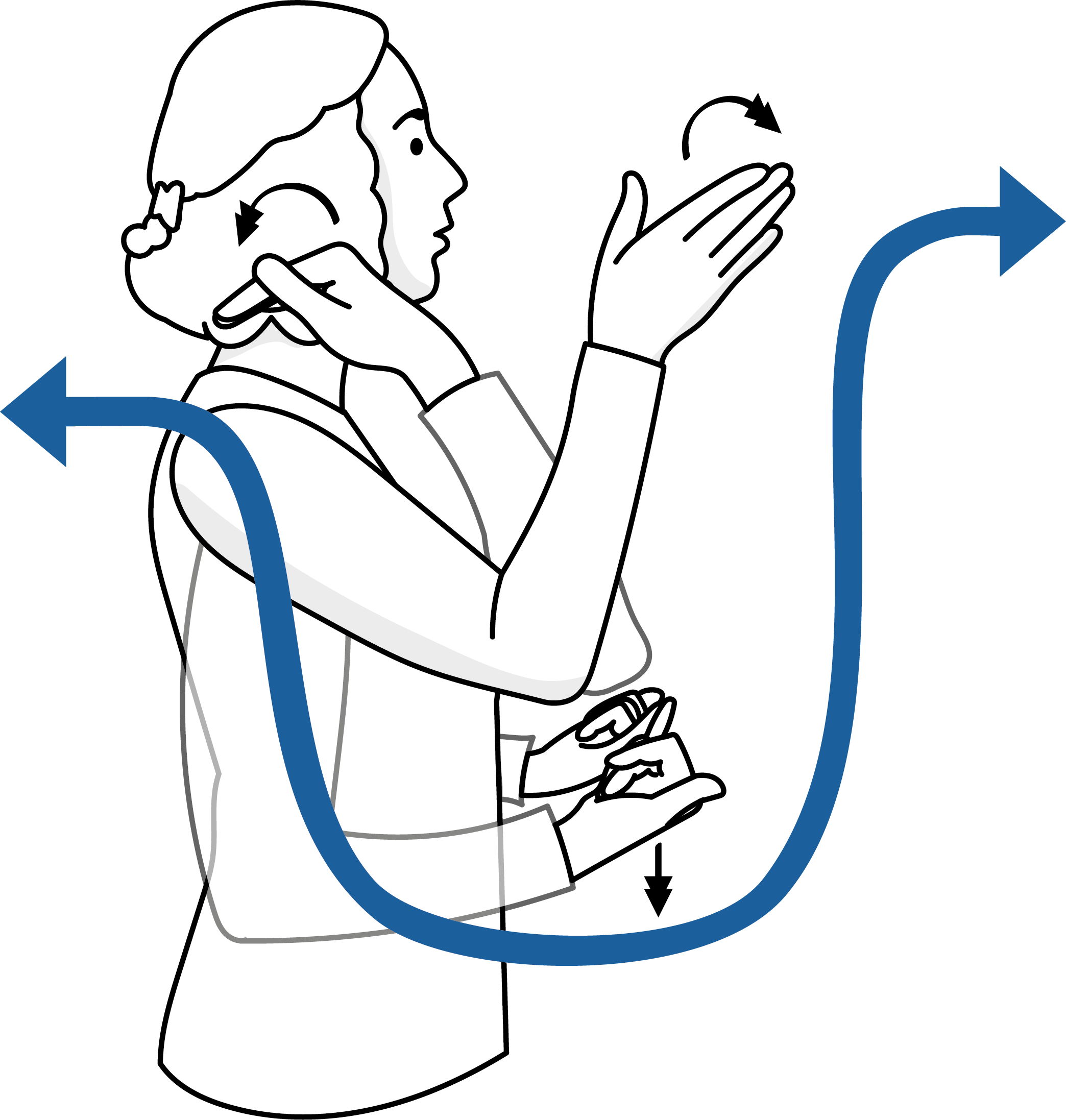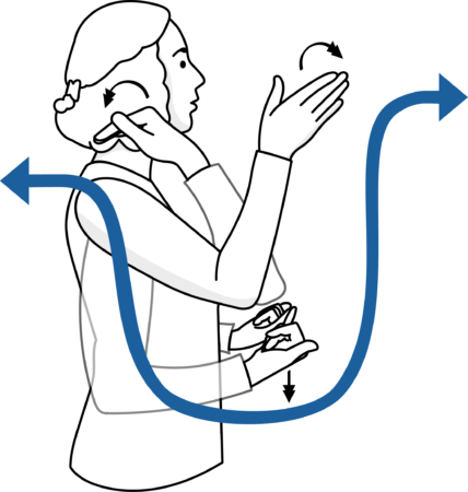 Die sagittale Zeitlinie verläuft von der Schulter der dominanten Hand bis in den Gebärdenraum vor dem Oberkörper.
